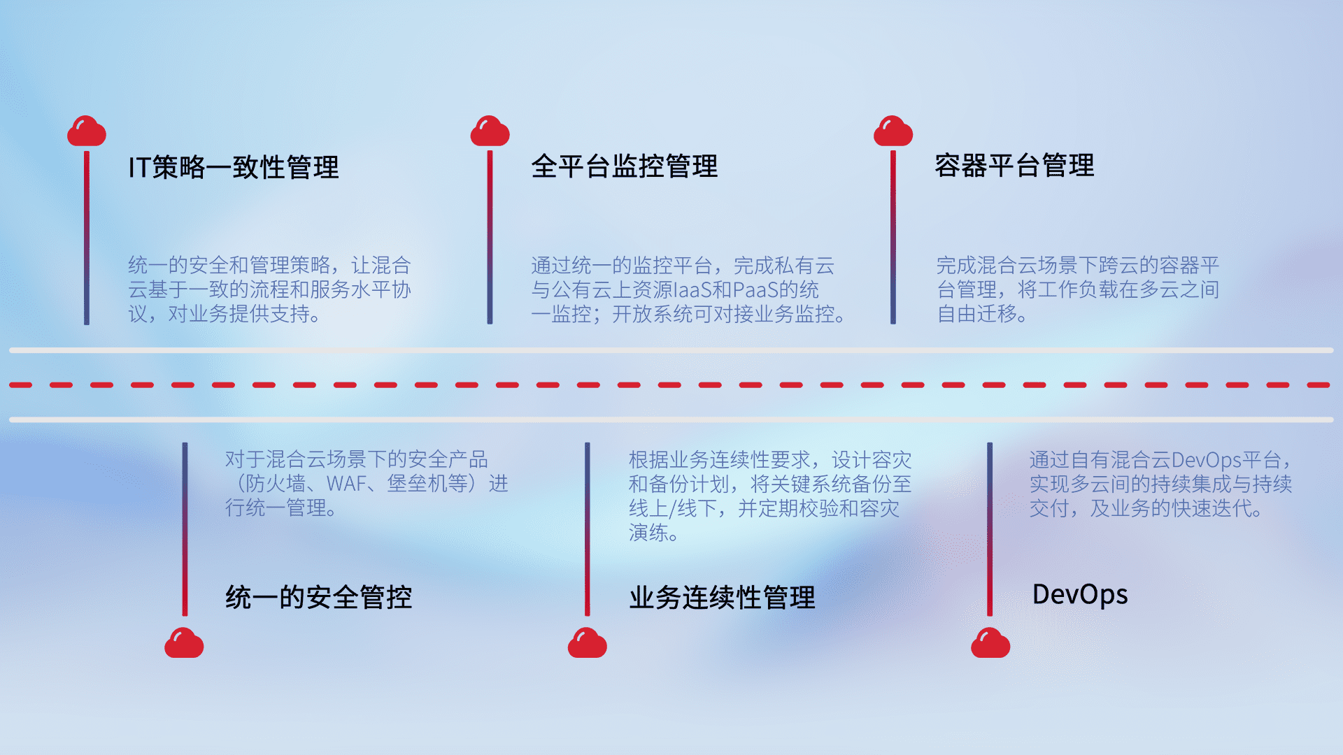 通过多云纳管,,,以统一的资源数据模型把客户的云资源进行抽象和封装,,,进而实现对多云资源的统一操作,,保障云资源管理的可靠性、、、稳定性与可用性。。。。量身定制化运维内容,,,,配置、、开发运维、、、补丁管理、、、备份、、、、监控、、、认证和访问管理、、、、审计和日常巡检等,,,保障在用云过程中的可靠度,,,,稳定度以及高可用率。。。。
